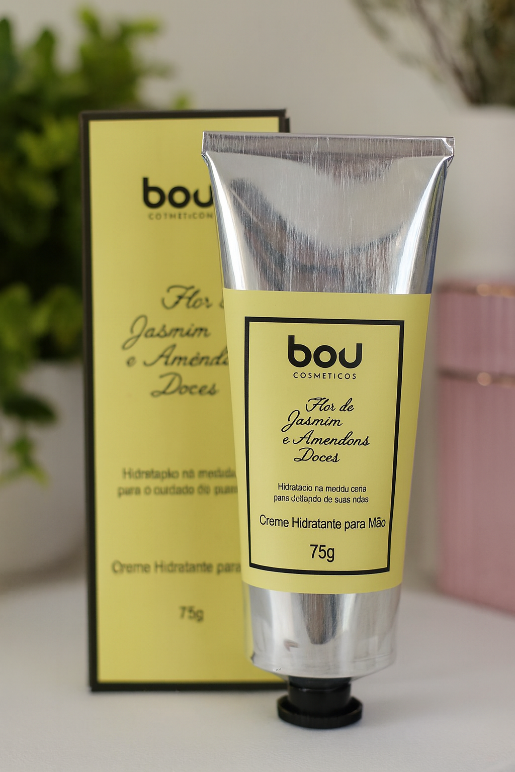 O Creme para as Mãos Flor de Jasmim e Amêndoas Doces é apresentado em bisnaga metálica decorada com tampa de rosquear contida em uma bela caixinha de papelão que remete ao tema da coleção.