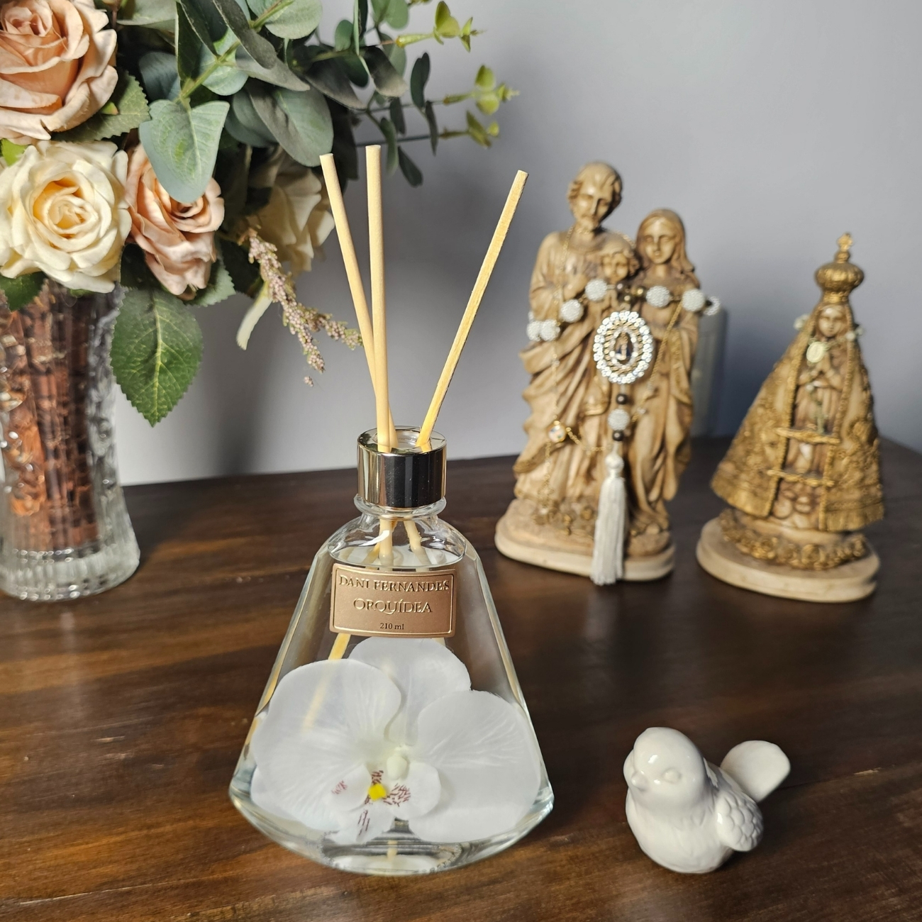 O Difusor Orquídea é apresentado em um recipiente de vidro decorado com uma linda placa dourada e com uma linda flor de orquidea branca artificial em seu interior.
