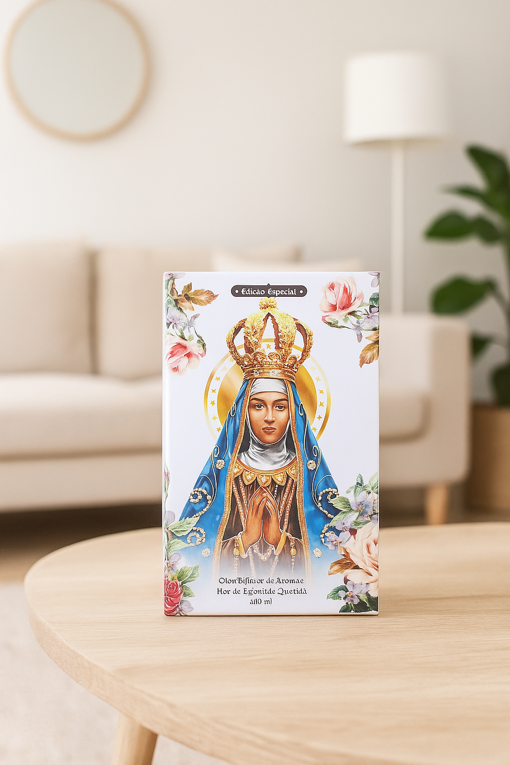 O Difusor Flor de Figo Mãe Querida é apresentado em um recipiente de vidro luxuosamente decorado com um lindo laço de cor preta e a foto da Ave Maria, com 210 ml da fragrância Flor de Figo da Dani Fernandes.