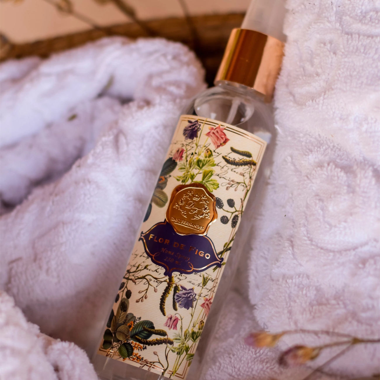 O Home Spray Flor de Figopossui spray com válvula dourada e um adesivo alusivo a coleção, com figos, flores e folhas.
