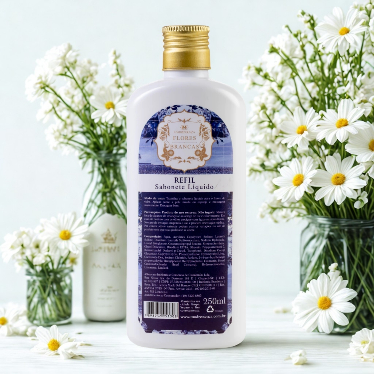 Concebido na coleção Flores Brancas da Madressenza, o Sabonete Líquido Flores Brancas refil 250 ml é apresentada em um frasco pet, ideal apra você repor seu Sabonete Líquido Flores Brancas