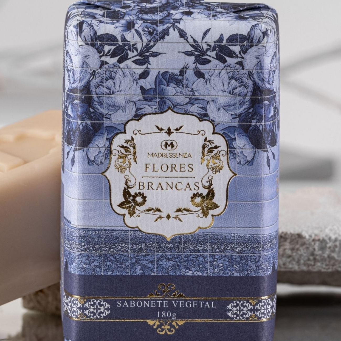 Concebido na coleção Flores Brancas da Madressenza, o Sabonete Vegetal Flores Brancas é apresentado em um papel macio com desenhos de azulejos portugueses de flores.