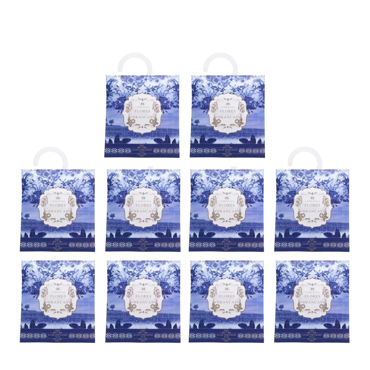 Concebido na coleção Flores Brancas da Madressenza, o Sachê Flores Brancas é apresentada em um papel macio com desenhos de azulejos portugueses de flores.